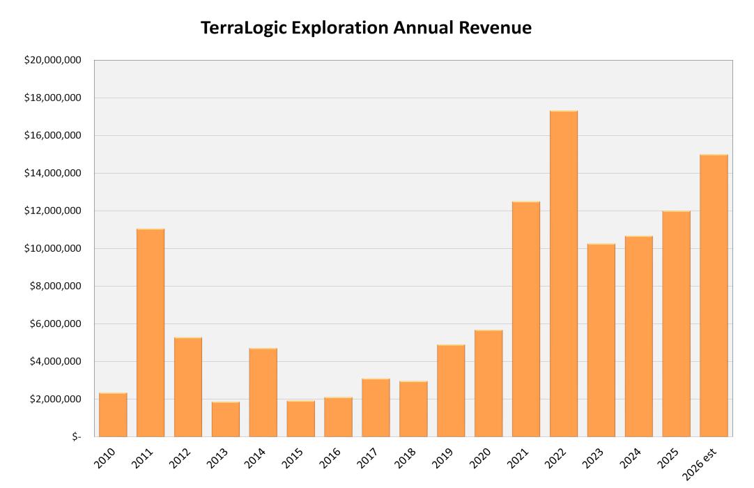 Below is a chart depicting the annual revenue generated by Terralogic Exploration through geological consulting services conducted for 3rd parties.