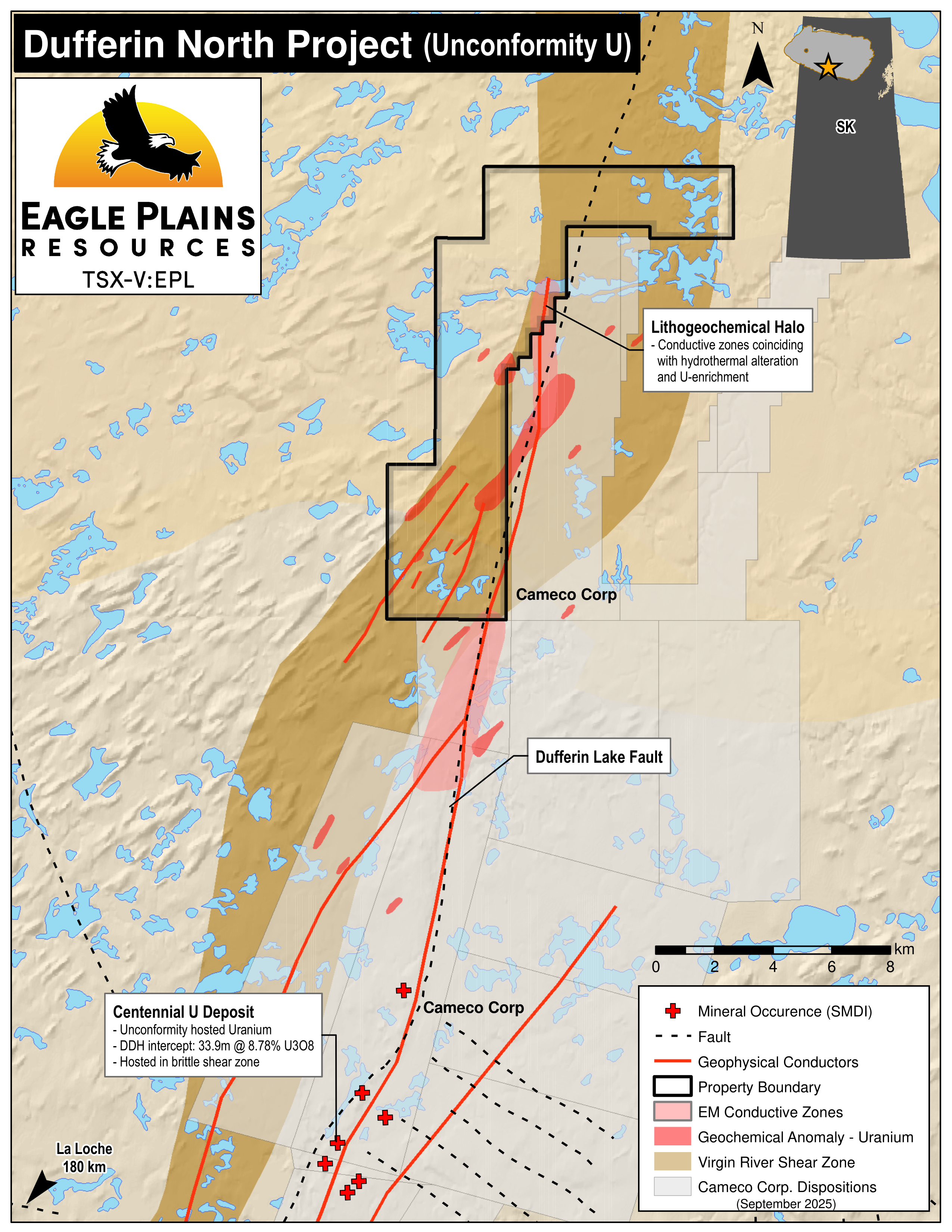 Several uranium and polymetallic uranium occurrences occur along and proximal to the Dufferin Lake fault SE of the VRSZ. The inferred trace of this fault follows EM conductors and overlaps surficial geochemical anomalies on the eastern edge of Dufferin North. Structures with proven uranium mineralization are ideal targets for further exploration. Regional EM conductors are underexplored and locally coincide with regional geochemical anomalies at Dufferin North. The subsurface projection of the VRSZ through most of this tenure suggests the possibility of basement structures favourable for hydrothermal fluid flow.