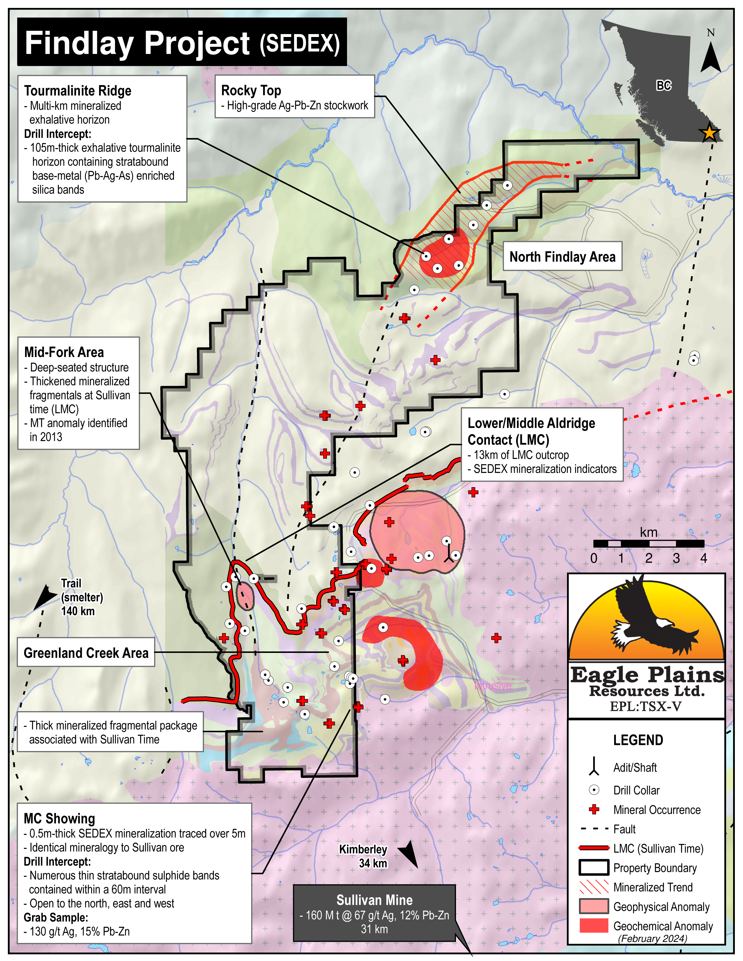 The Findlay Project overlies Aldridge Formation stratigraphy, considered prospective for sedimentary-exhalative (“SEDEX”) deposits. Structurally, this area has been identified as an extension of the North Star-Sullivan corridor which hosts the world-class Sullivan deposit 30 km to the south. The Findlay Property displays Sullivan-style exhalative tourmaline (boron) horizons, massive fragmental sections, anomalous lead and zinc geochemistry, and base-metal occurrences. This “Sullivan-smoke” occurs throughout the Lower to Upper Aldridge formation and indicates the potential for Sullivan-style mineralization at multiple stratigraphic levels. Fieldwork by Eagle Plains has identified a number of targets including:
