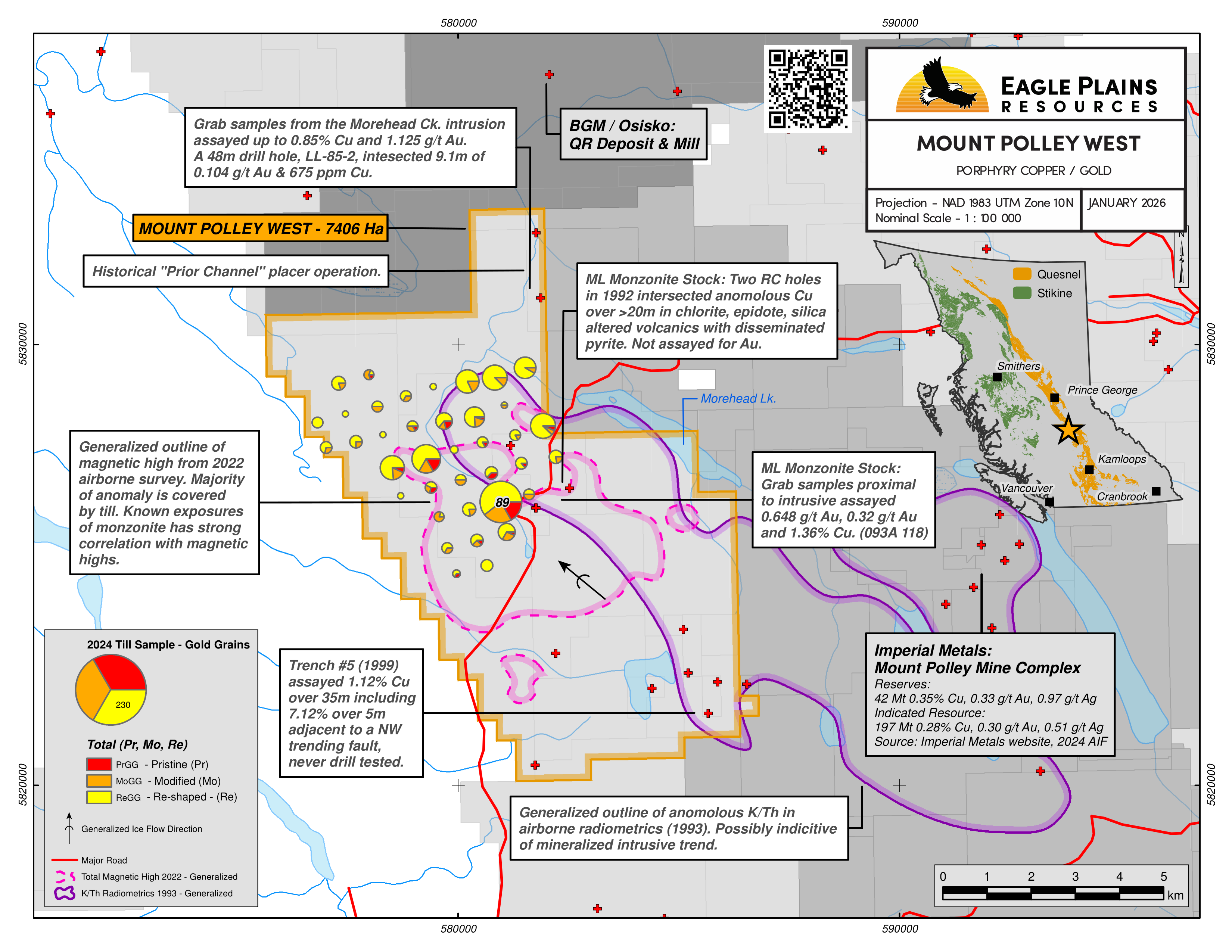 Sampling and analysis of glacial till can be an effective tool in vectoring toward bedrock sources of mineralization. Till sampling by Eagle Plains in 2023 yielded up to 52 grains of gold in the NW of the property indicating the potential for an up-ice mineralized source. Similar numbers of gold grains are found in tills down-ice from Mount Polley. Overlapping radiometric and magnetic anomalies are also present in the central part of the project area which are consistent with the geophysical signature of Mount Polley.